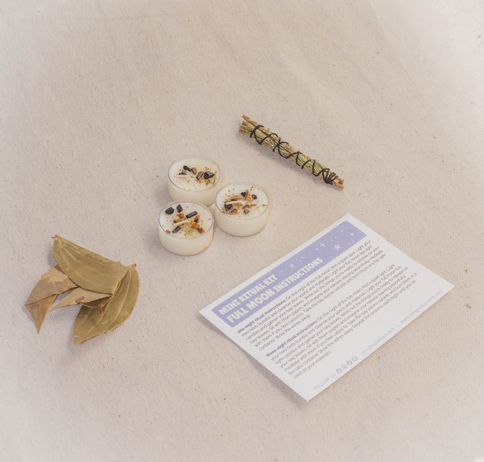 Cleanse your space with your mini bundle, light your full moon tea light candle, spend some time in meditation, and write your full moon release on your bay leaf. Then, burn that bay leaf under the full moon to give your intentions a physical form and watch them blow away in smoke.