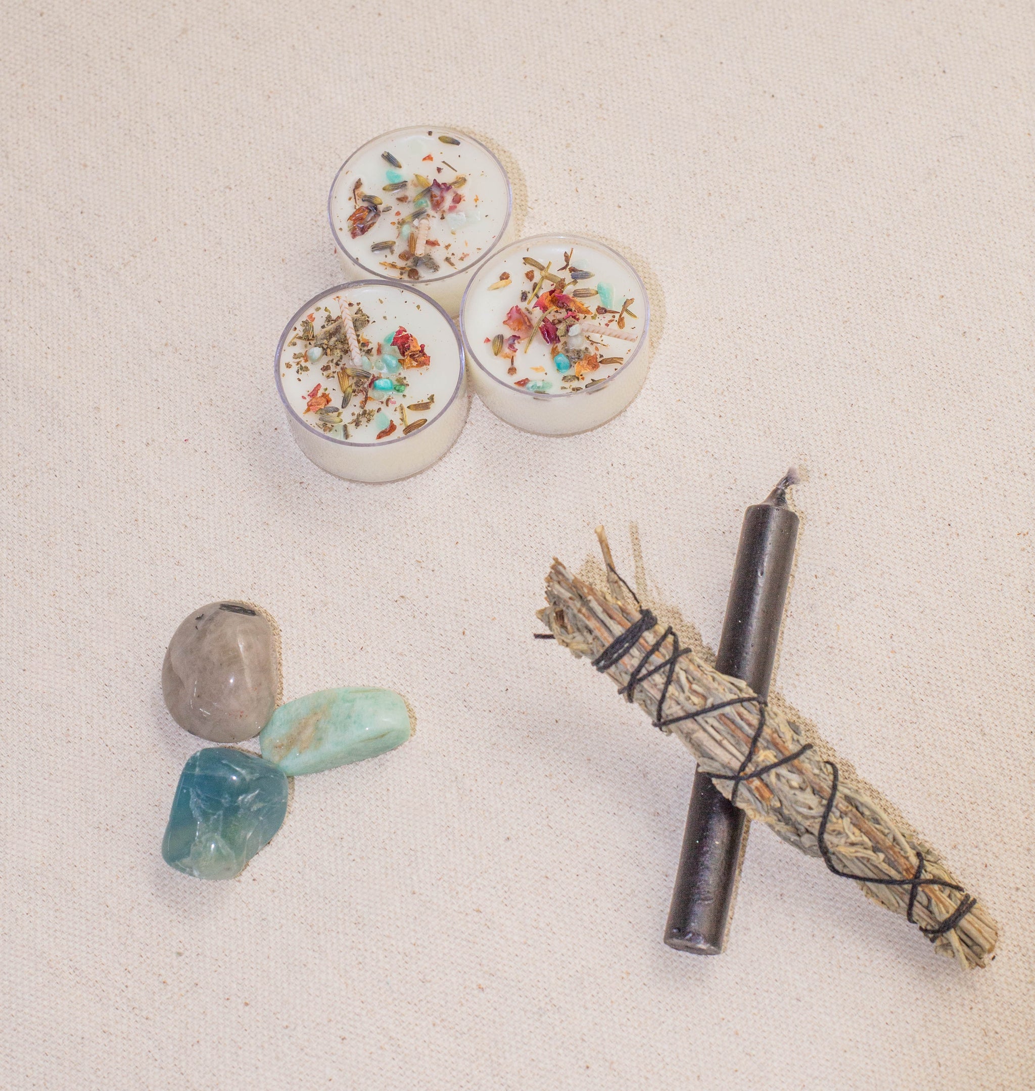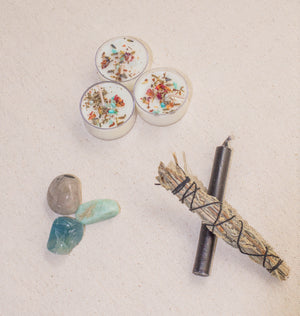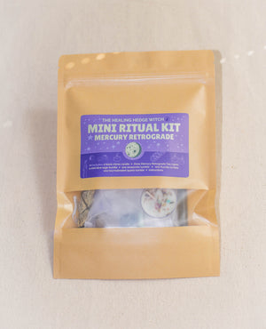 Protect your energy during Mercury Retrograde with this Mini Ritual Kit! Includes a black chime candle, three Mercury Retrograde Tea Lights, a mini blue sage bundle, one amazonite tumble, one tourmalinated quartz tumble, and one fluorite tumble, plus instructions for your Mercury Retrograde ritual!